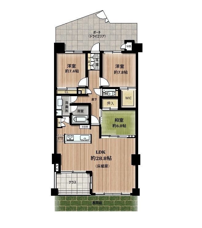 ・専有面積はなんと112.13㎡! ・ゆったりリビングは約28.8帖 ・リビング床暖房つき♪ ・専用ポーチ・テラス・お庭付き ・自走式駐車場完備! ・室内リフォーム予定のキレイなお部屋です♪ |